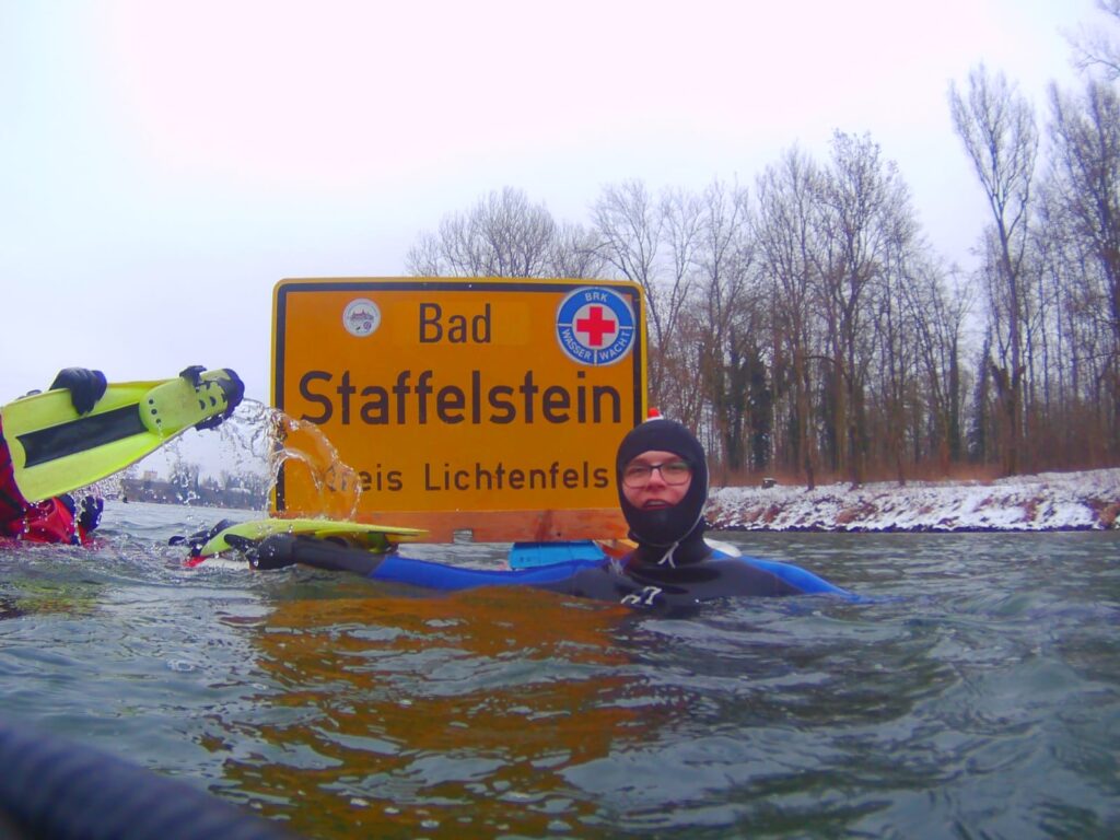 Schon auf dem Dammweg bot sich ein beeindruckendes Bild: Unzählige kostümierte Schwimmer machten sich am Ufer und im Wasser mit ihren schwimmenden Konstruktionen bereit. Auch der Verbund der Ortsgruppen aus dem Kreisverband war mit einem großzügig zur Verfügung gestellten Ortsschild von Bad Staffelstein gut erkennbar vertreten. Mit dem Startschuss begann schließlich die rund vier Kilometer lange Strecke flussabwärts. Bei nur geringer Strömung, einer Lufttemperatur von knapp einem Grad und einer Wassertemperatur von etwa 3,5 Grad Celsius hielten alle 20 Schwimmer der vier Ortsgruppen tapfer durch. Gute Stimmung, gegenseitige Motivation und Gedanken an den Sommer halfen dabei, der Kälte zu trotzen. Die Zielgerade wurde an der Elisenbrücke erreicht, wo hunderte Zuschauer die Schwimmer lautstark anfeuerten. Aufwärmen konnten sich alle anschließend im nahegelegenen Parkbad.